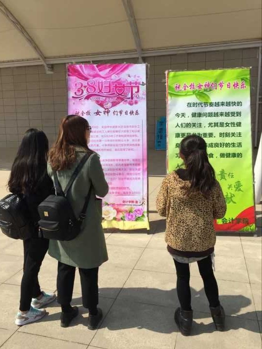 展板的内容分为两个模块,其一展板主要介绍了关于三八妇女节的起源和发展,据展板介绍,在1903年3月8号,美国芝加哥的女工和全国纺织,服装业的工人举行大规模的罢工和游行,要求增加工资,实行八小时工作日和选举权,这是历史上第一次妇女有组织的群众斗争,充分显示了劳动妇女的力量。紧接着,在第一次世界大战前,帝国主义瓜分全世界,为维护世界正义在1910年的哥本哈根国际主义妇女大会上,会议决定每年的3月8号为妇女节。另一展板关注到了现如今越来越快的生活节奏带给女性很大的压力,温馨地提醒女性关爱自己,愉悦生活。